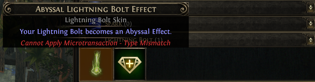 Hello. I bought the "Abyssal Lightning Bolt Effect" skill effect in the store, but it does not apply to the "Lightning Bolt" obtained from the amulet "Choir of the Storm, Jade Amulet", BUT it applies to the same skill obtained from the Voltaic Staff. Why? It's the same as the skills you get, I want my Lightning Bolt from the "Choir of the Storm" to be beautiful, please. Thank you.