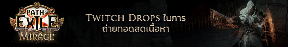 วิธีรับของรางวัลเพียงแค่ผูกบัญชี Path of Exile ของคุณเข้ากับ Twitch (ตามวิธีด้านล่าง) แล้วรับชม GGG Live ผ่านทาง www.twitch.tv/pathofexile หรือแชนแนลใดๆ ที่อยู่ในหมวด Path of Exile เป็นเวลา 45 นาที โดย Twitch Drops จะเปิดการใช้งานตั้งแต่ 27 กุมภาพันธ์ 2:00 น. จนถึง 28 กุมภาพันธ์ 2:00 น. หรือวันพฤหัสบดีที่ 26 กุมภาพันธ์ 2026 เวลา 14:00 น. จนถึง วันศุกร์ที่ 27 กุมภาพันธ์ 2026 เวลา 14:00 น. ตามเขตเวลาในบัญชีของคุณคุณจะได้รับเอฟเฟคอาวุธมิราจ หลังจากที่รับชมแชนแนลใดๆ ที่สตรีม Path of Exile ที่ระบุว่า Drops Enabled รวมกันครบ 45 นาทีในช่วงเวลาของกิจกรรมนี้ ซึ่งแปลว่าทุกคนที่รับชมการสตรีม Path of Exile ใดก็ตามจนครบจำนวนเวลาที่กำหนดจะได้รับของรางวัลนี้ไปอย่างแน่นอน โปรโมชั่นนี้มีให้กับบัญชีทุกระบบ หากคุณวางแผนว่าจะสตรีม Path of Exile ขณะที่เราจัดงานถ่ายทอดสดแล้วต้องการเปิดใช้ Twitch Drops ให้กับผู้ชมของคุณ คุณสามารถเปิดการใช้งานได้จาก Twitch Creator Dashboard นะคะ วิธีผูกบัญชี Path of Exile ของคุณเข้ากับ Twitchล็อกอินแล้วเข้าไปที่หน้าการตั้งค่า Twitch หากบัญชีของคุณยังไม่ได้รับการเชื่อมต่อ กดปุ่ม "เชื่อมต่อ" สำหรับ Twitch ที่อยู่ด้านล่าง "การเชื่อมต่ออื่นๆ" จากนั้นทำตามกระบวนการใน Twitch ให้เรียบร้อย แล้วคุณจะถูกส่งกลับมายังหน้าการตั้งค่า Twitch ของคุณใหม่ ทั้งนี้หากบัญชีของคุณได้รับการเชื่อมต่อแล้ว หน้านี้ควรแสดงข้อความ "บัญชี Path of Exile ของคุณได้ผูกกับบัญชี Twitch ของคุณแล้วเมื่อคุณรับชมจนครบจำนวนเวลาที่กำหนดในการรับเอฟเฟคอาวุธมิราจ คุณจะต้องกดรับของรางวัลจากหน้า Twitch Inventory ก่อนที่จะหมดช่วงโปรโมชั่นนี้ แล้วรายการสินค้าแฟชั่นของคุณภายใน Path of Exile 1 และ 2 จะมีของรางวัลชิ้นนี้ให้คุณใช้งานโดยทันที โดยเอฟเฟคอาวุธมิราจจะมีให้ซื้อจากร้านค้าในอนาคต= เรารอนำเสนอรายละเอียดของ Path of Exile: Mirage อยู่นะคะ! อย่าลืมจับตาดูข่าวคราวความคืบหน้าก่อนที่จะถึงการถ่ายทอดสดได้ทาง Twitter, Facebook, Facebook ไทย และเว็บบอร์ดของเรา ไว้เจอกันในงาน GGG Live ผ่านทาง www.twitch.tv/pathofexile ค่ะ! |
